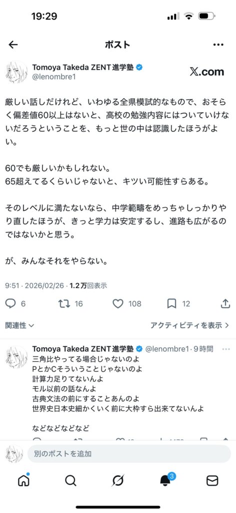 このツイートは、「偏差値65以下は大学受験を諦めよう!」とか、そういう趣旨のものではないよ。